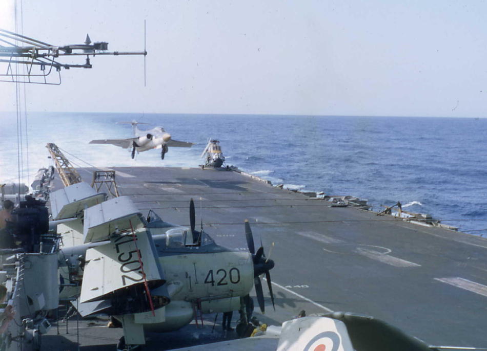 Plane guard's view of a Sea Vixen landing on.