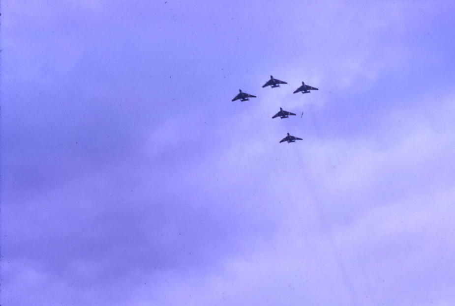 Four Buccaneers and four Sea Vixens seen in a formation fly past.